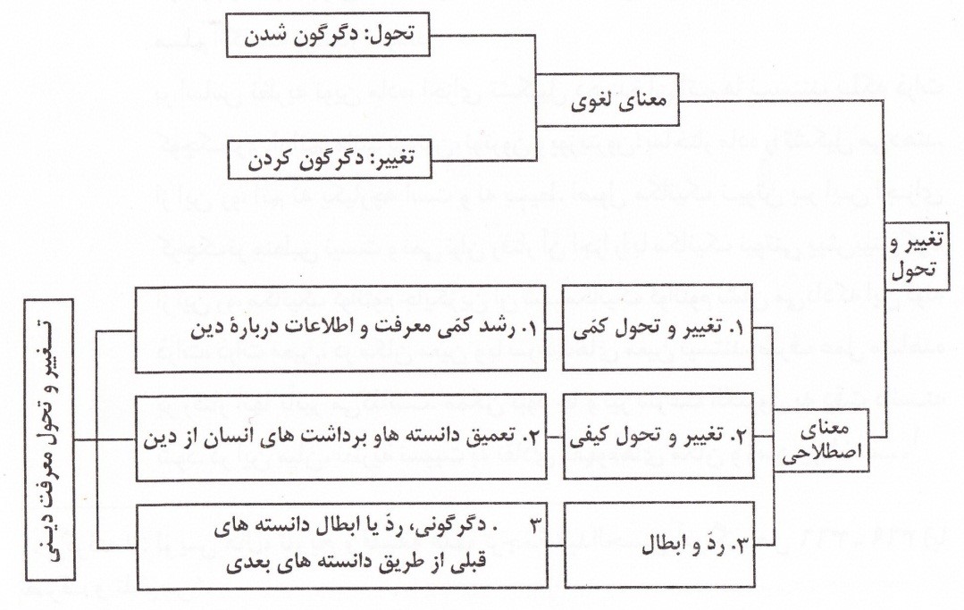 تغییر و تحول در لغت به معنای دگرگونی است. اما از این دو کلمه معانی اصطلاحی متعددی برداشت می شود که ما سه معنا را محتمل می دانیم. برای توضیح به نمودار زیر دقت کنید.